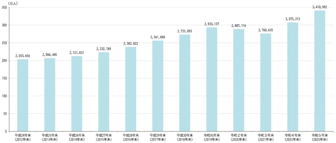全国的に、人口減少に伴う人材不足が課題となる中、外国人労働者の雇用は伸び続けており、国内の在留外国人数は、コロナ期を除いて増加し続けています。