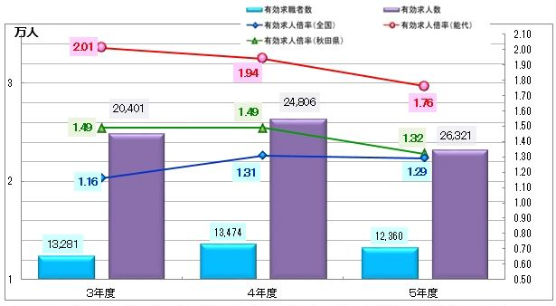 令和5年度における能代山本管内における平均有効求人倍率(能代)は1.76倍で、秋田県平均、全国平均と比較してもかなり高い数値です。ここ数年、有効求人倍率は高い状態で推移し続けており、人材不足が深刻な地域となっています。